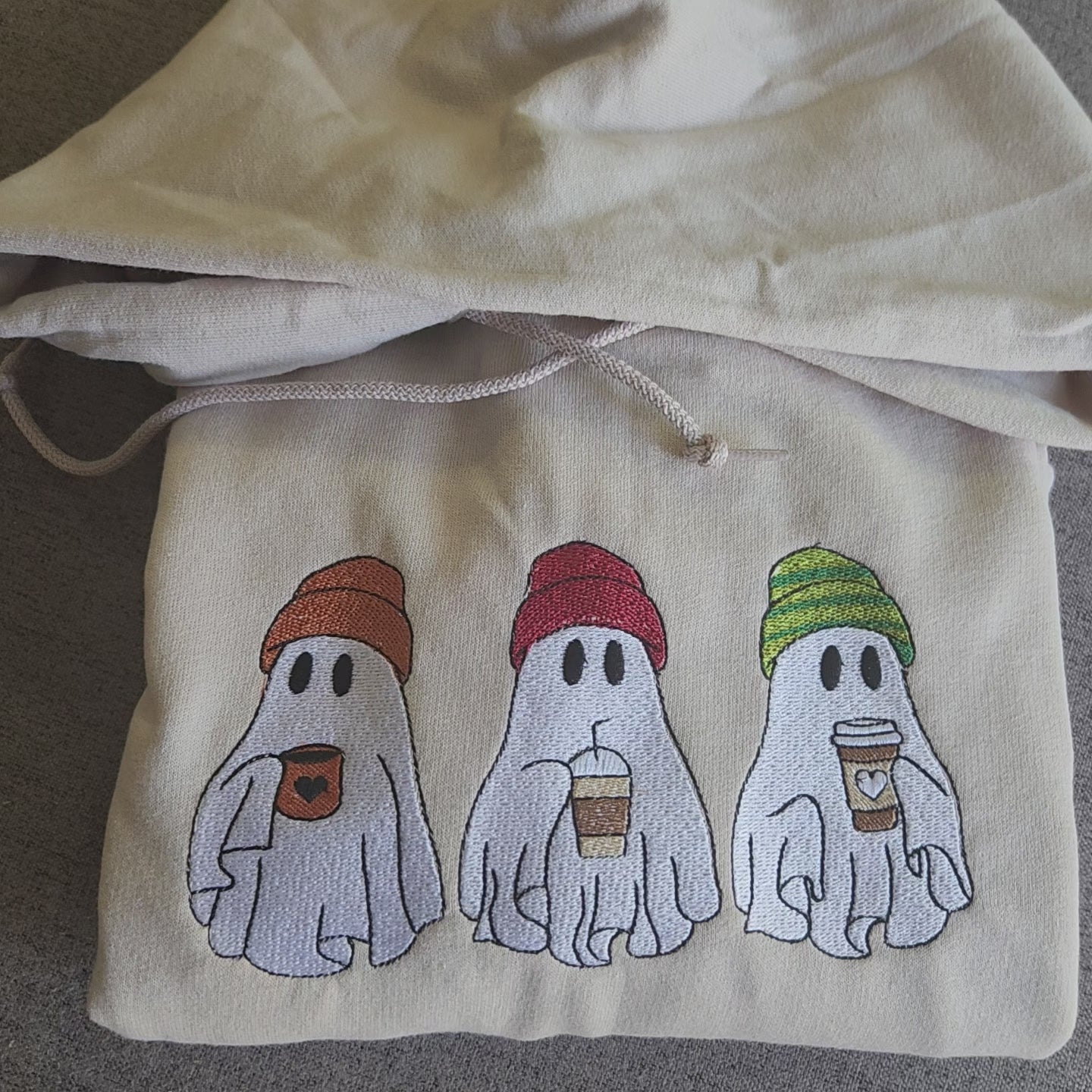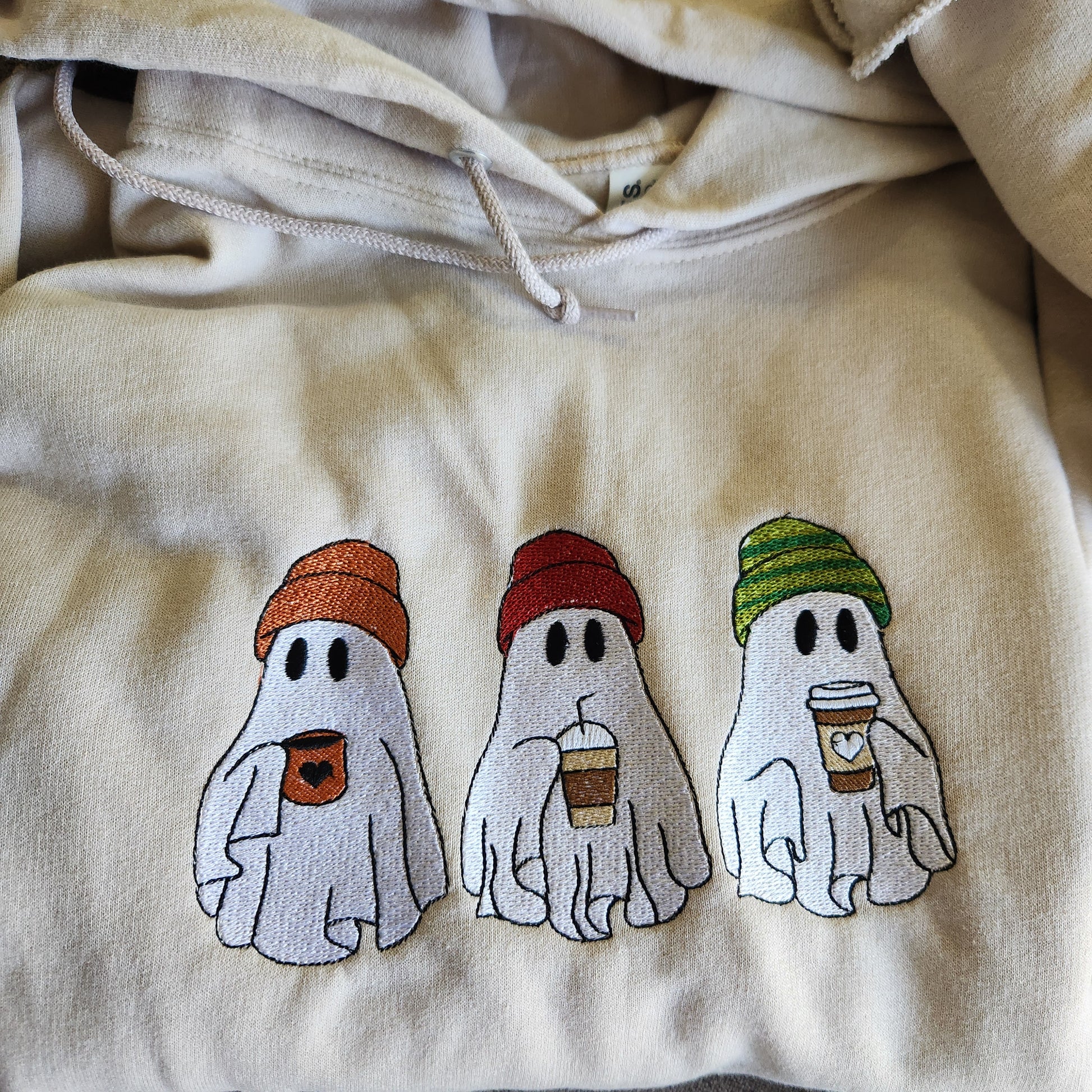 Snuggle up in this ultra-soft hoodie featuring three adorable little ghosts rocking their beanies and sipping on their favorite fall drinks. Perfect for chilly autumn days, pumpkin patch visits, or just curling up with your own cup of coffee.